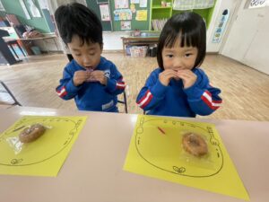 みんなでサンタさんからのお菓子のドーナツとゼリーを食べました!