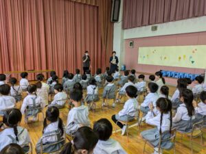 ひよこ組・年少組の子どもたちは、初めて合同礼拝を捧げるので、どんなことをするんだろう…と楽しみにしていました。