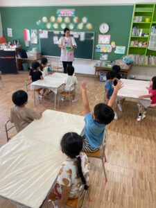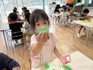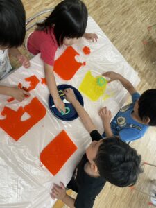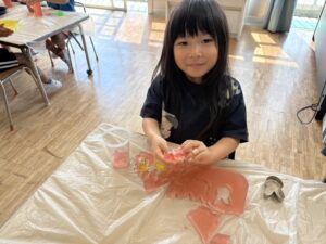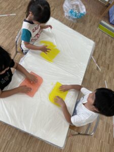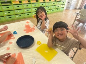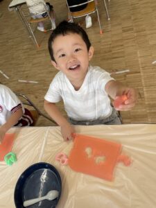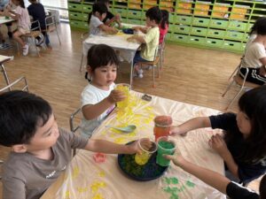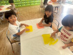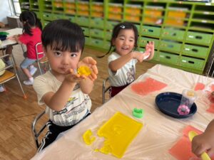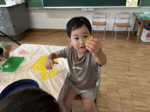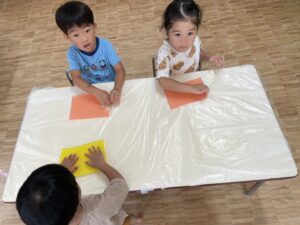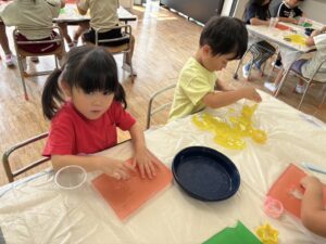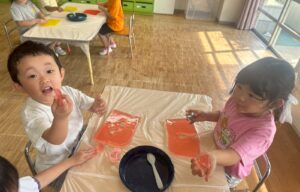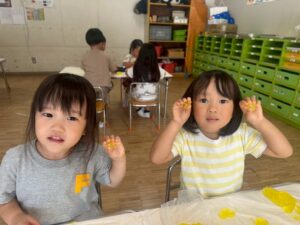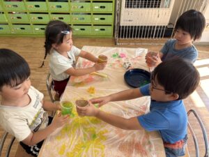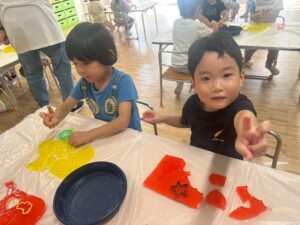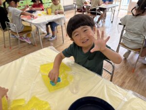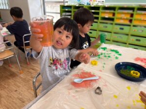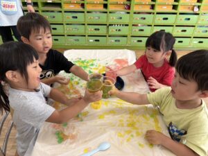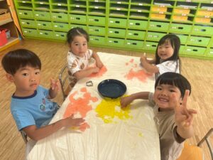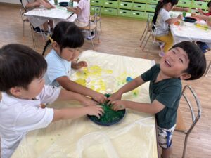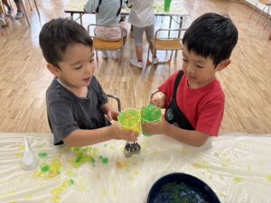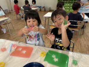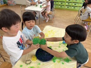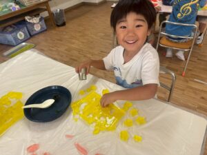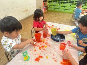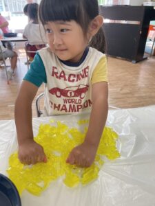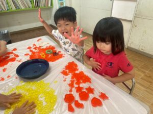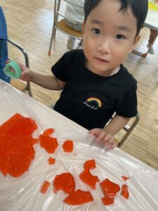 寒天のひんやり、プルプルの感触、手指でつぶしたり、ちぎったり…色や形の変化を喜びながら、寒天遊びを十分に楽しんだ子どもたちでした。