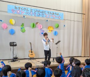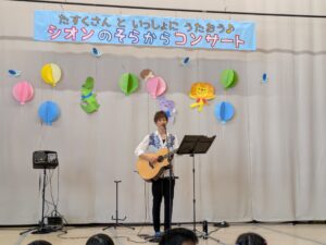 南光シオン幼稚園のテーマソング ♪シオンの空から を作詞・作曲をしてくれた翼taskuさんが幼稚園でコンサート(2回公演)をしてくれました!翼taskuさんが登場すると、みんな拍手!!