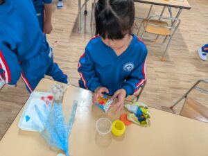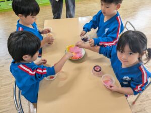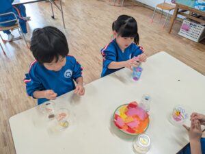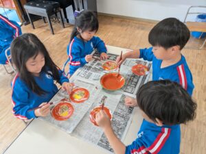 なのはな組は、絵の具で、ラーメンやうどん等の汁物を作っています。