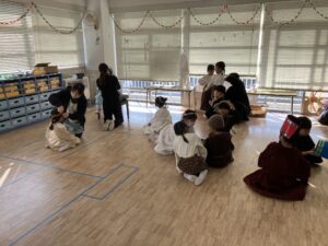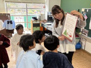 お話は「かいばおけのゆりかご」です。イエス様が誕生された話をみんな真剣に聞いていました。