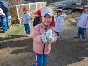 「つめたい~!」と言いながらも、雪玉作りをしています。