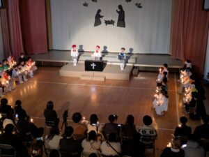 幼稚園最後のクリスマス会。「イエス様のお誕生をみんなでお祝いしよう」と、心を込めて練習に取り組んでいた年長組。神様から与えられた大切な役や劇の意味を理解しながら、演じてくれました。長い台詞や動き、たくさんの讃美歌…覚えることが多くありましたが、さすが年長組。子どもたちの演技力は、とても見ごたえがあり、素晴らしいクリスマス会となりました。