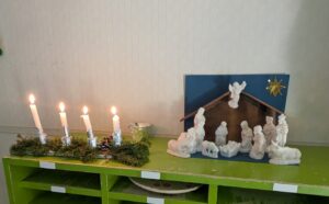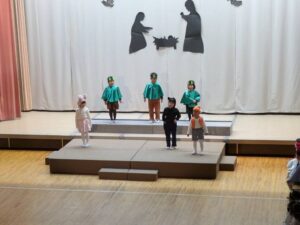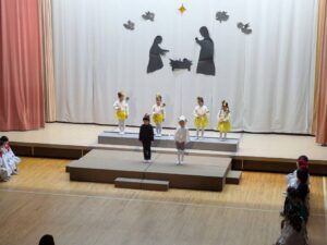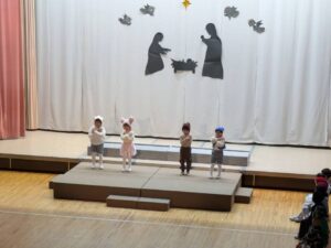 クリスマス会をとても楽しみにしていた年中組。一人ひとりが自分の役を精一杯演じ、緊張しながらも立派に台詞を大きく言ったり、讃美歌もきれいに響かせてくれました。イエス様をお祝いする気持ちが伝わる素敵なクリスマス会となりました。