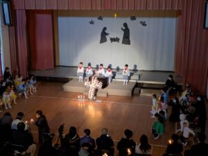 初めてのクリスマス会。沢山のお客さんの前でドキドキしていましたが、最後まで皆と一緒に頑張ったひよこ組・年少組さん。あの雰囲気の中、舞台に上がるだけでもすごいことなんです。小さい身体で台詞や讃美歌を歌う姿はとても素敵でした!そして、とっても可愛らしい姿に心が温まりましたね。