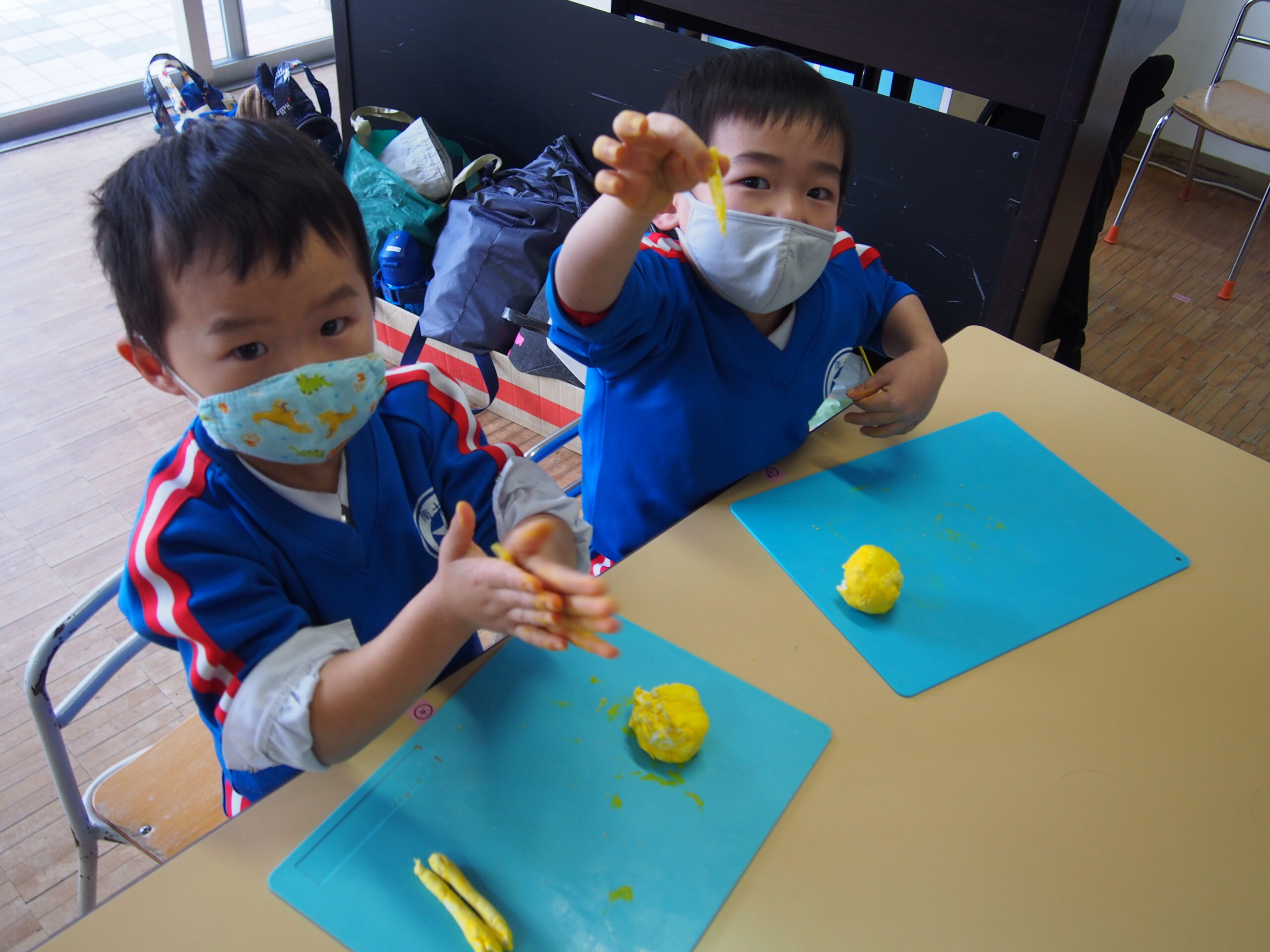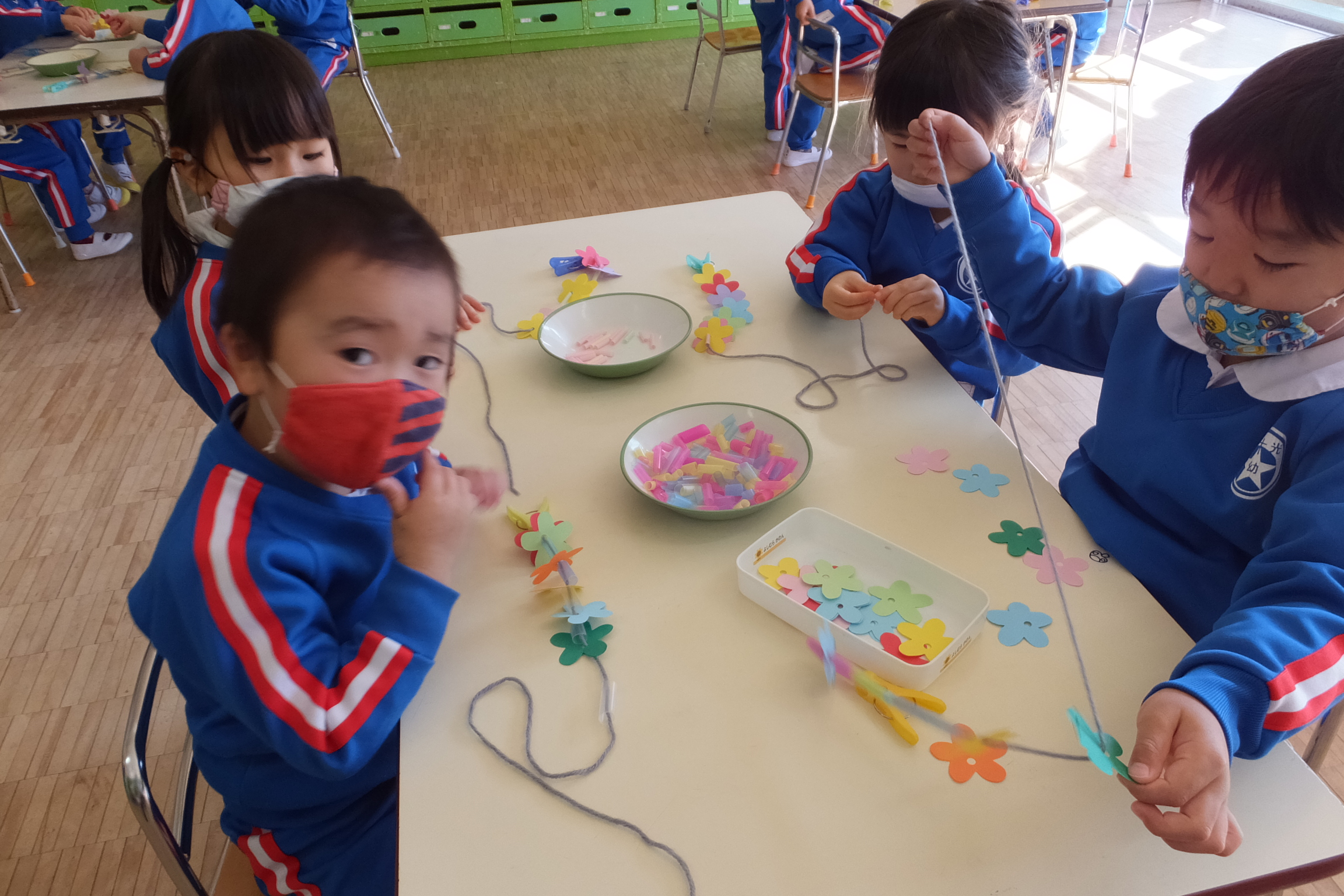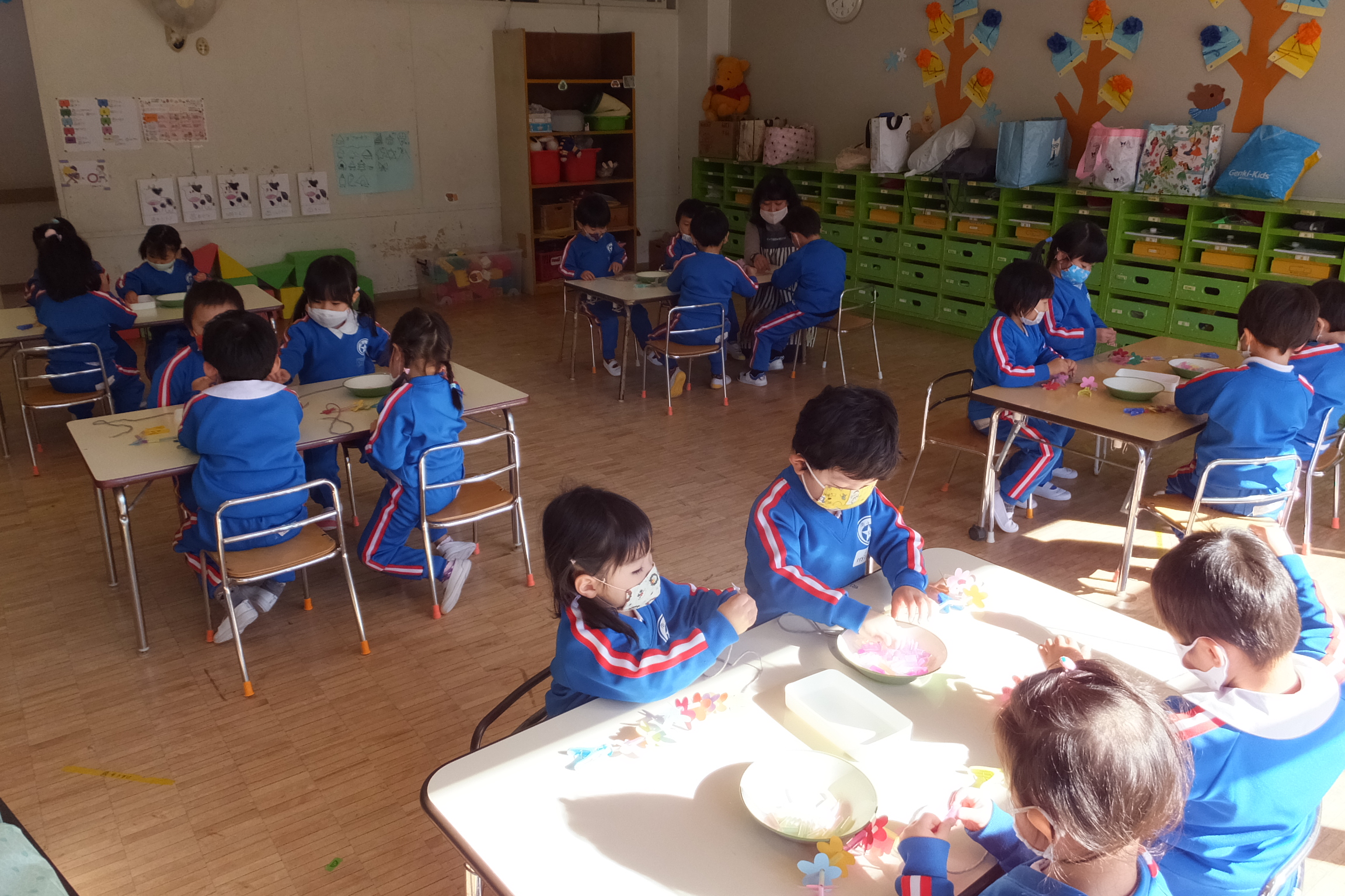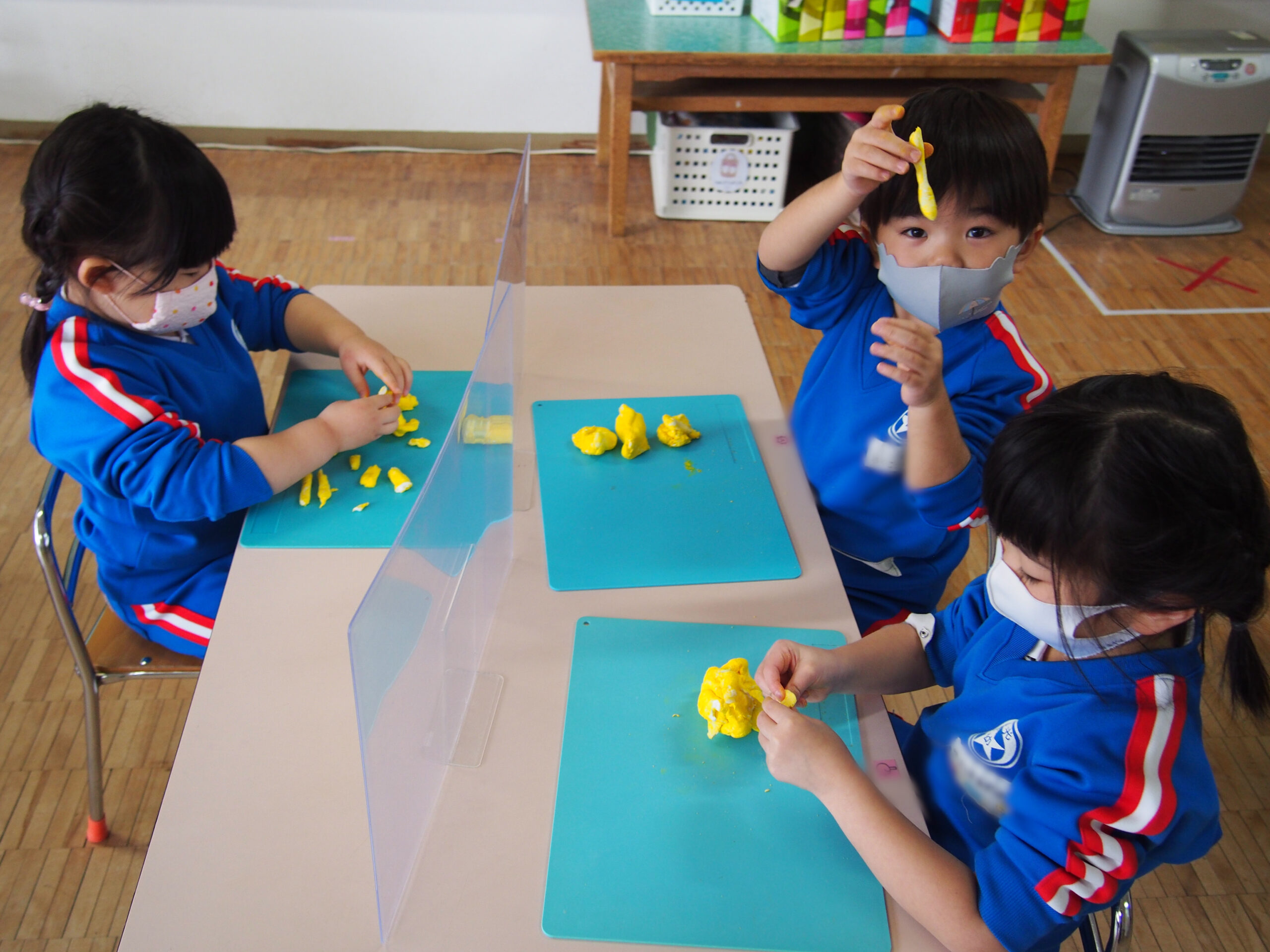 11月に行われたお店ごっこは、年中長さんがお店を開いてくれて、年少組とひよこ組(満3歳児)は、お買い物をしました。今回は、年少組とひよこ組のみんなで品物を作ってお店をオープンします!