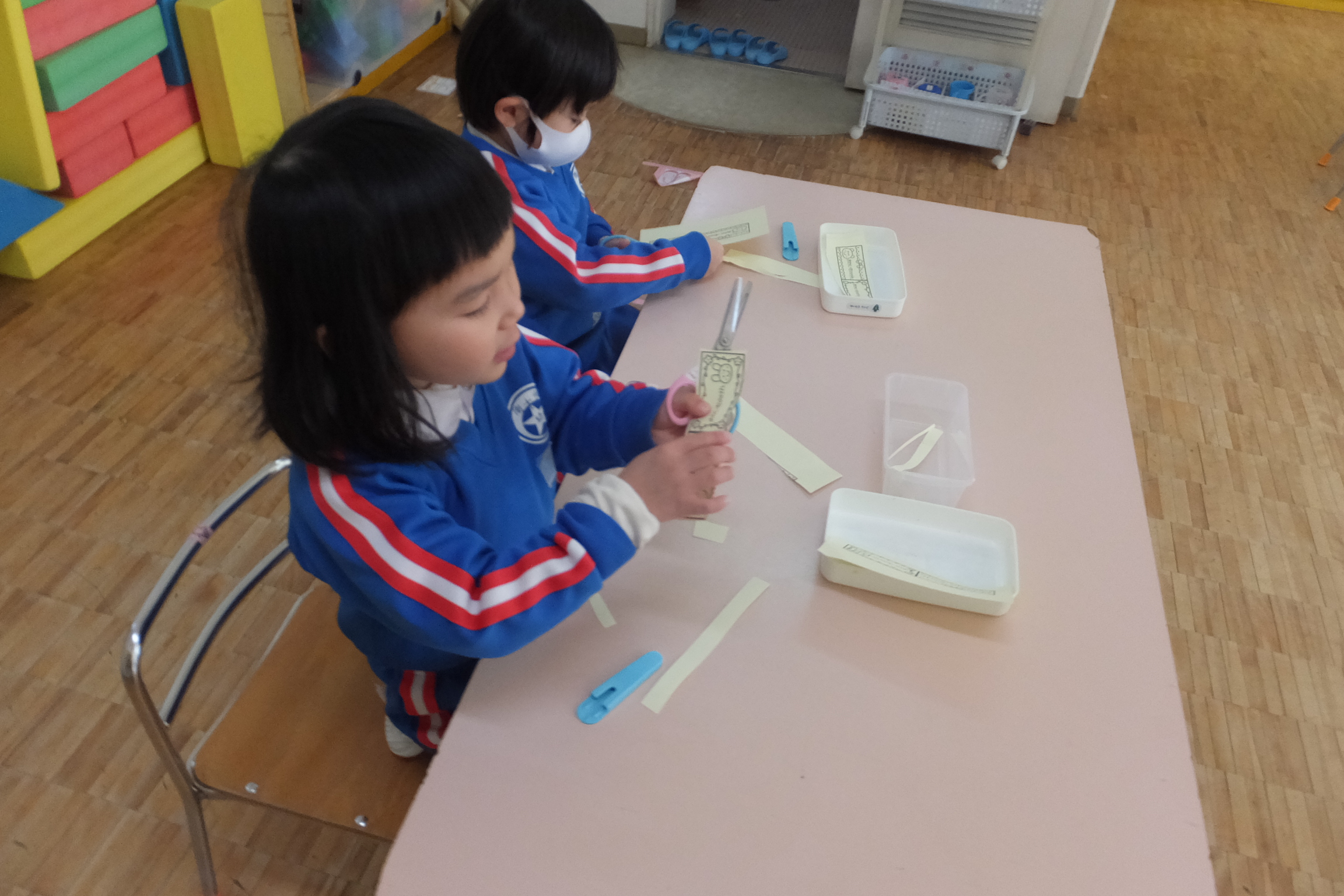 そして、年中長さんにお買い物で使ってもらう「おかいものけん」をはさみで切っています。