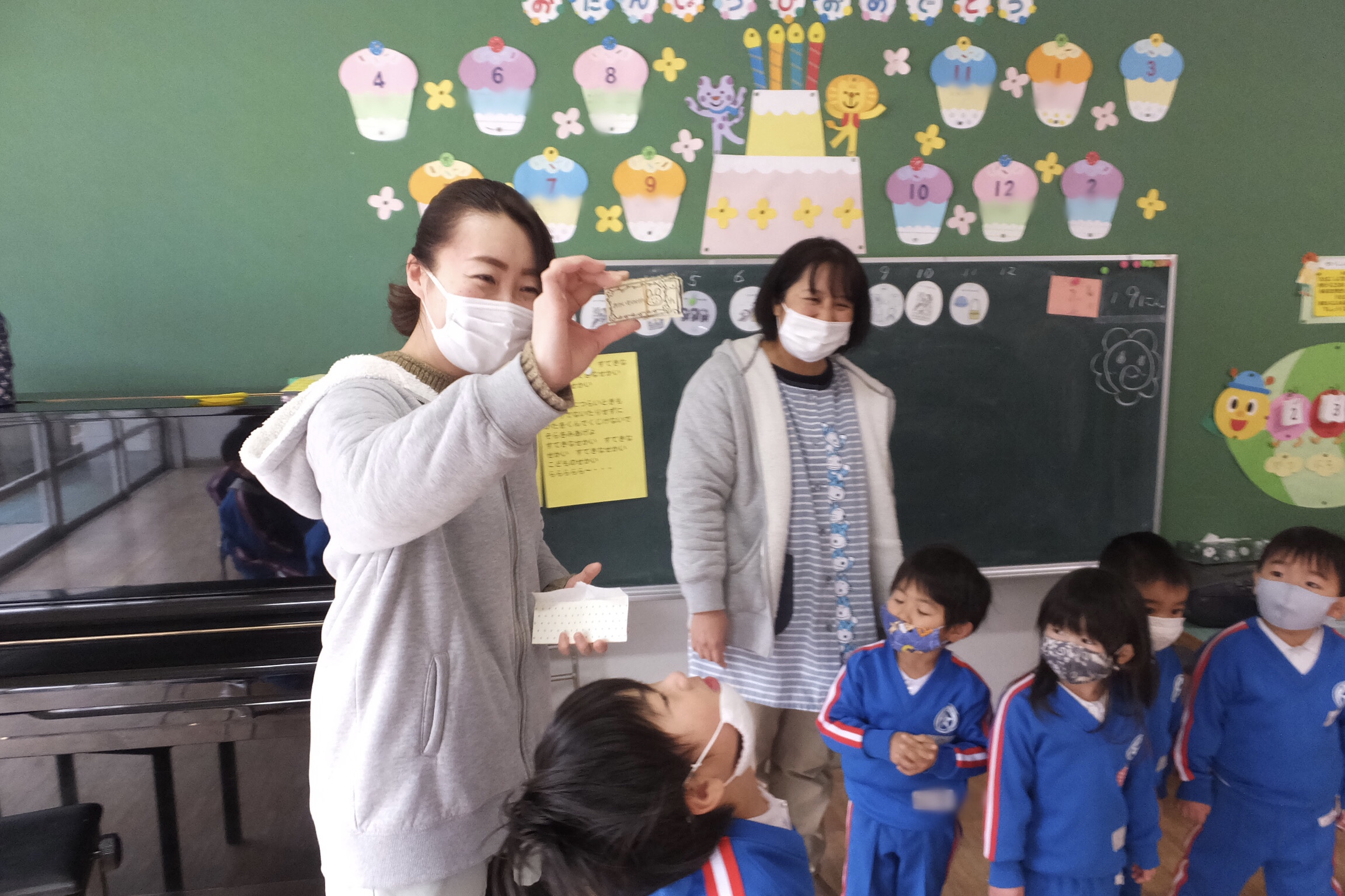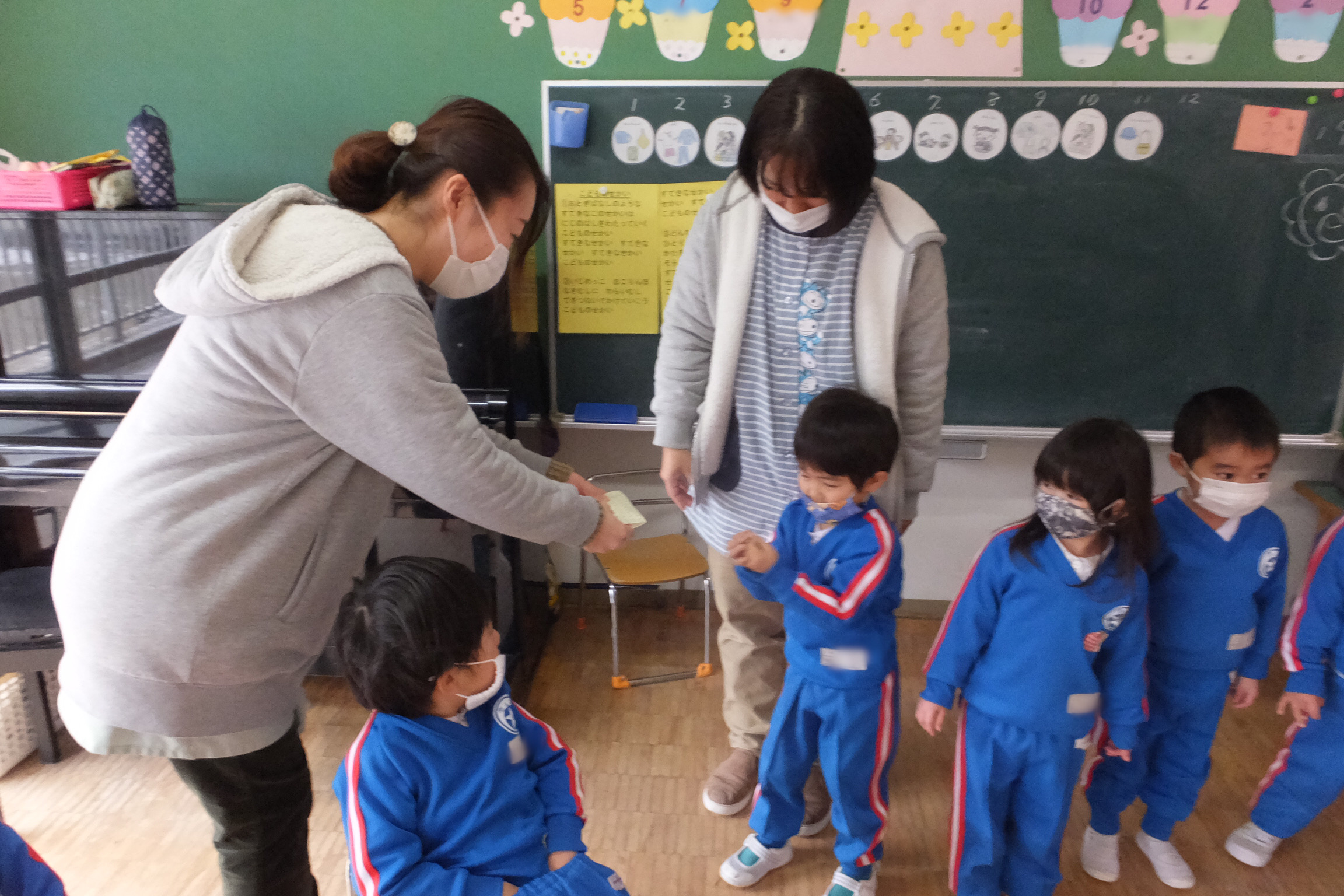その「おかいものけん」を年中長さんのクラスへ「お買い物にきてください!」と渡しにいきました。