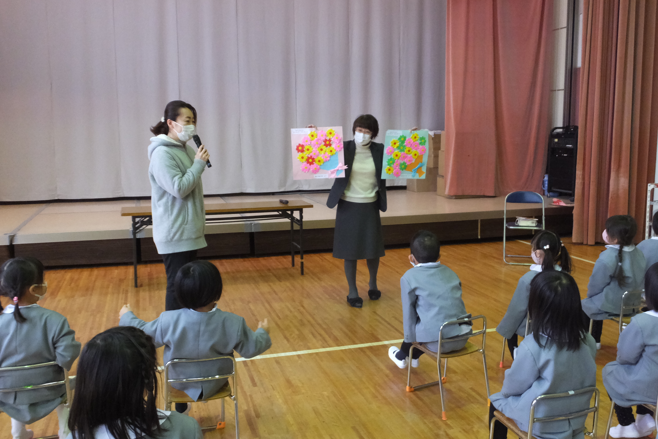 年中組は、一人一人折り紙でお花を折ったのを花束にしてプレゼントしました!