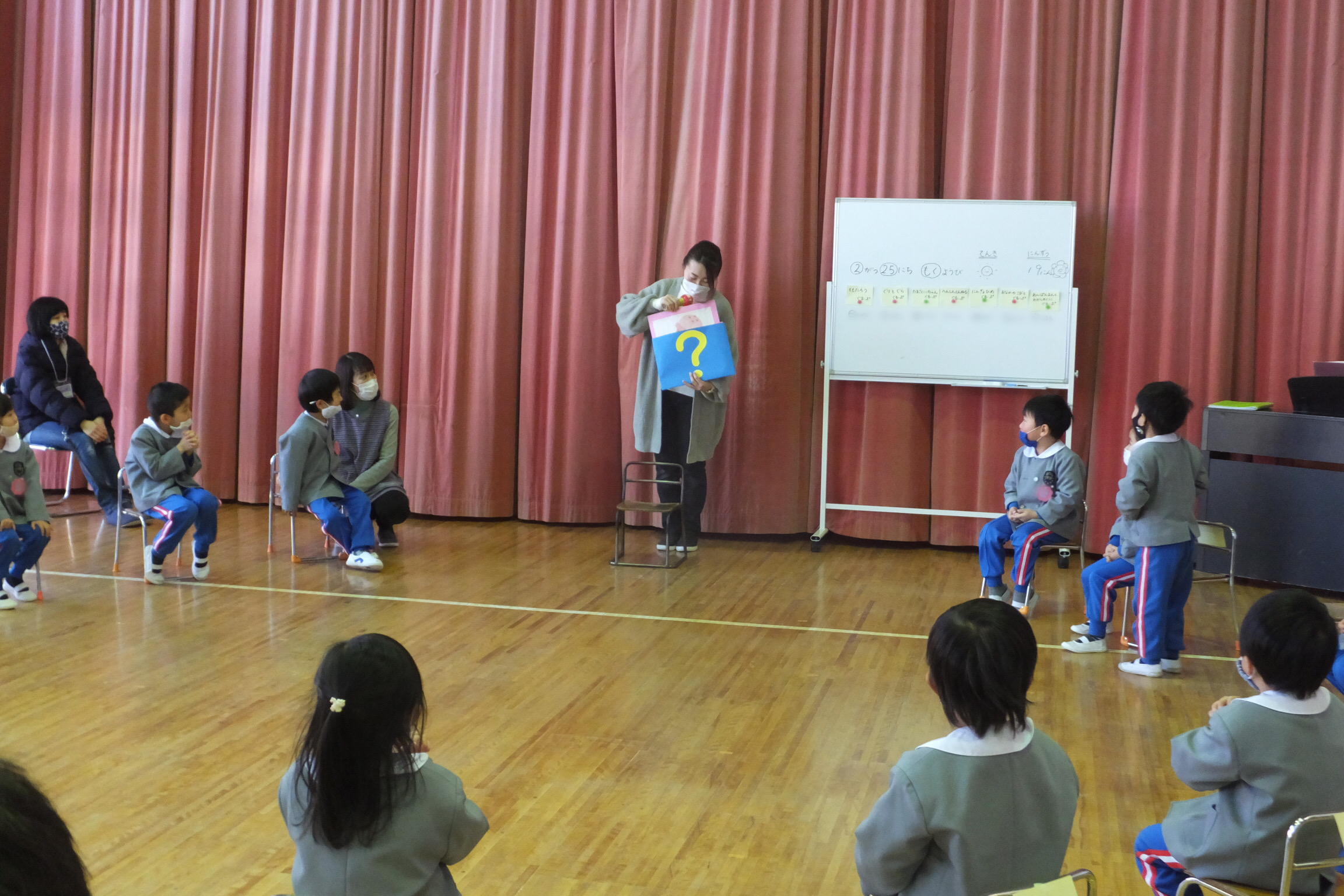 年中組は…もの当てクイズをしました!!先生からヒントをもらい、グループのみんなで話し合いをして答えを考えます。