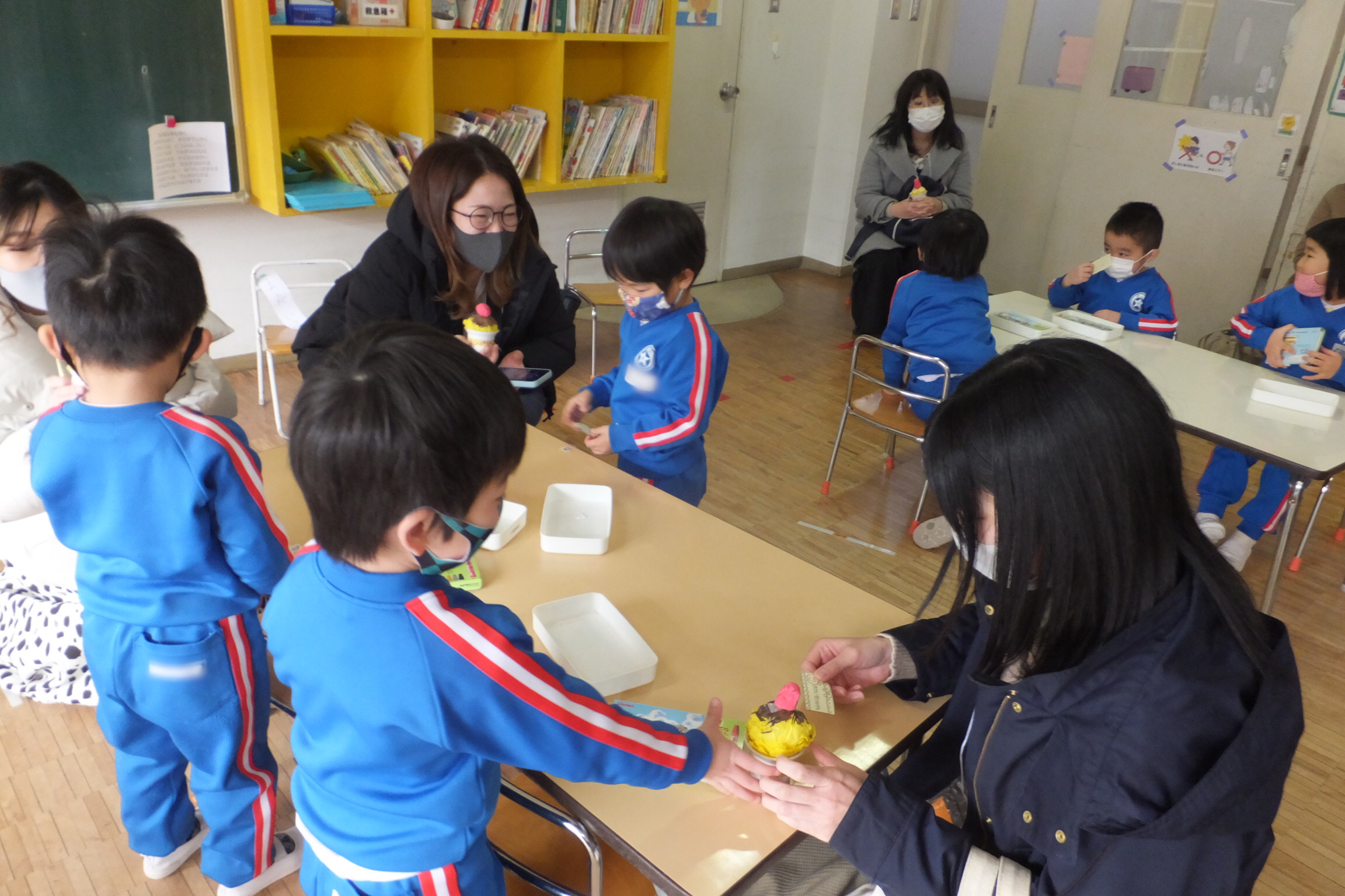この日は、お家の人とお店ごっこをしました。子どもたちは前もって、お買い物券をお家の人に渡し、とっても楽しみにしていたんですよ!