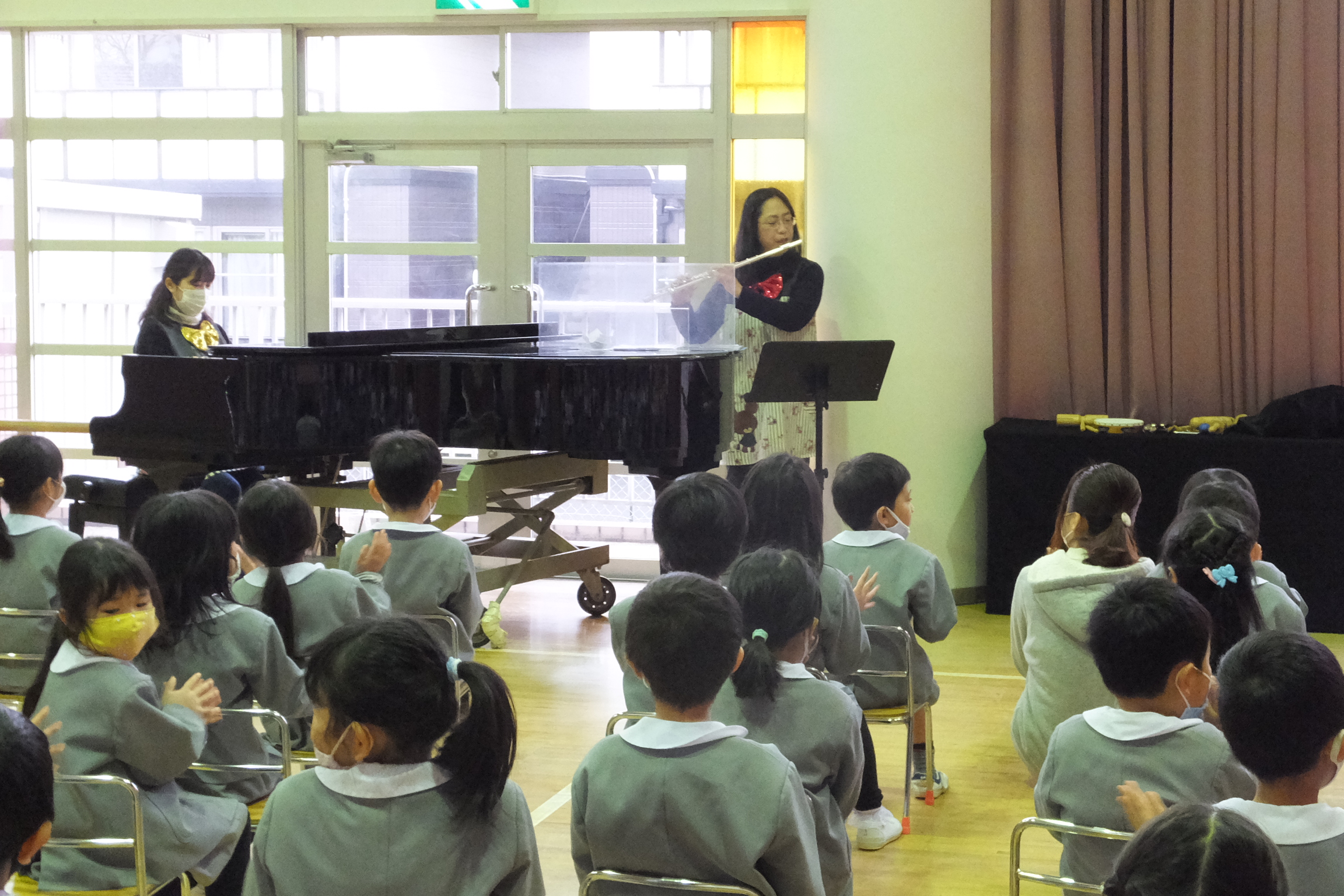 「音楽会♪」ひよこ組の先生たちが、ハッピーバースデーの曲をピアノとフルートで演奏し、「すごーい!」「きれいな音~!!」と目をキラキラさせていた子どもたち!シオンの子どもたちは、歌や音楽が大好きなので、大喜び!!