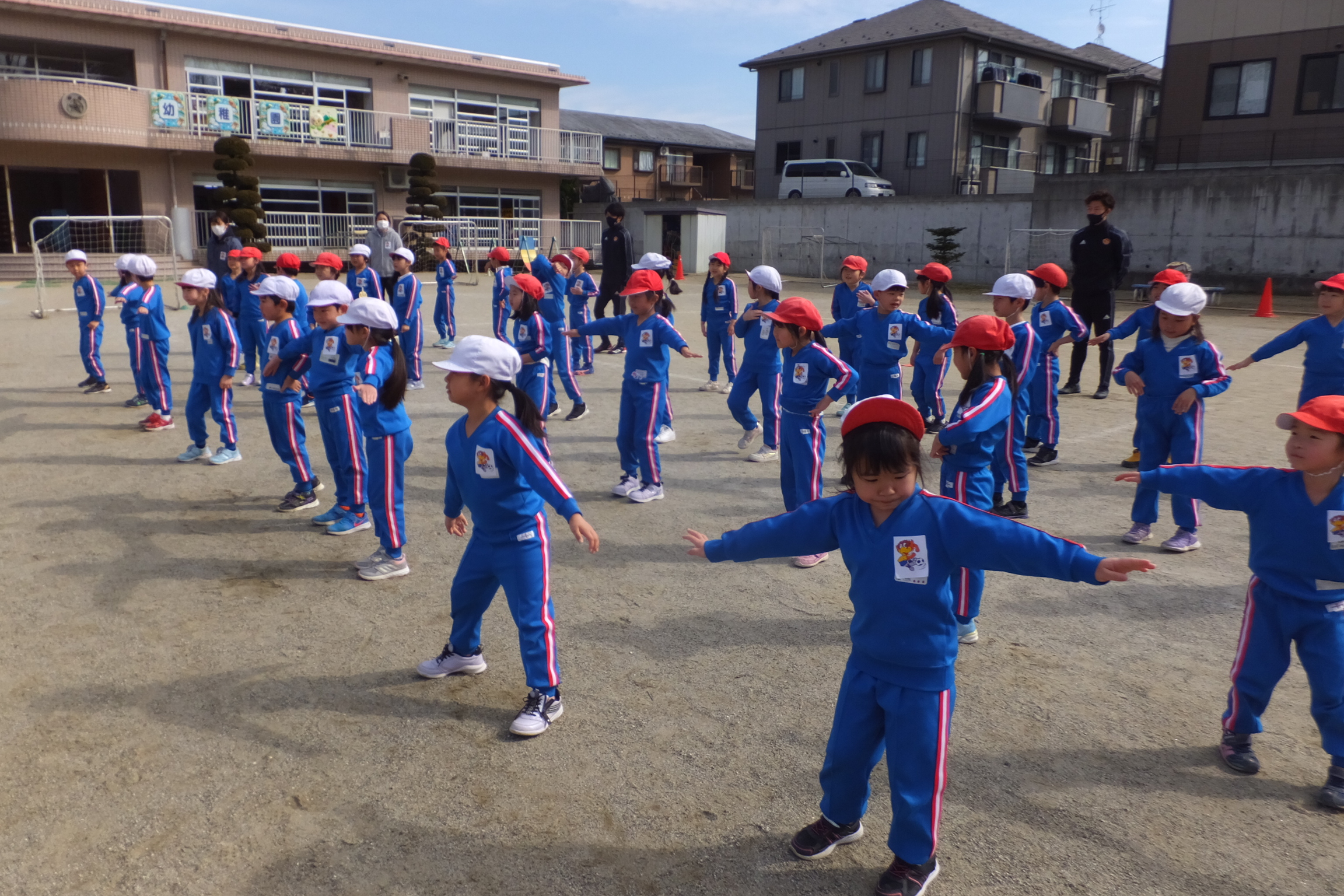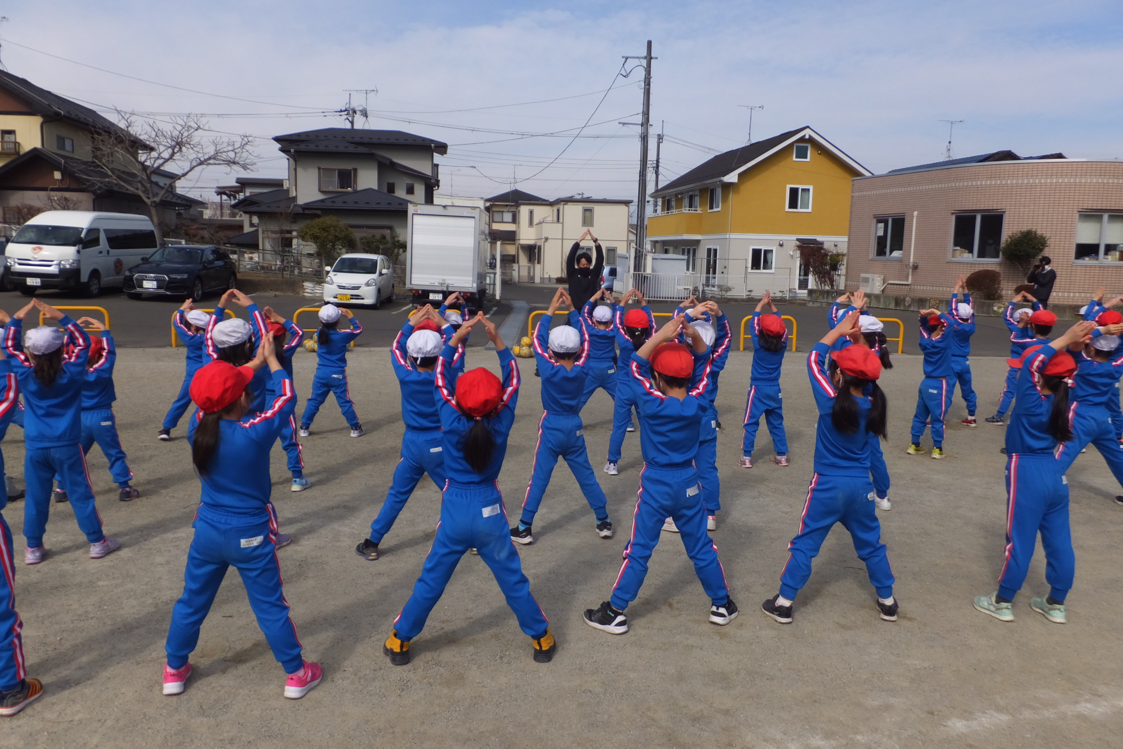 はじめは、みんなで準備体操です。ベガッ太くんを胸につけて張り切っています。