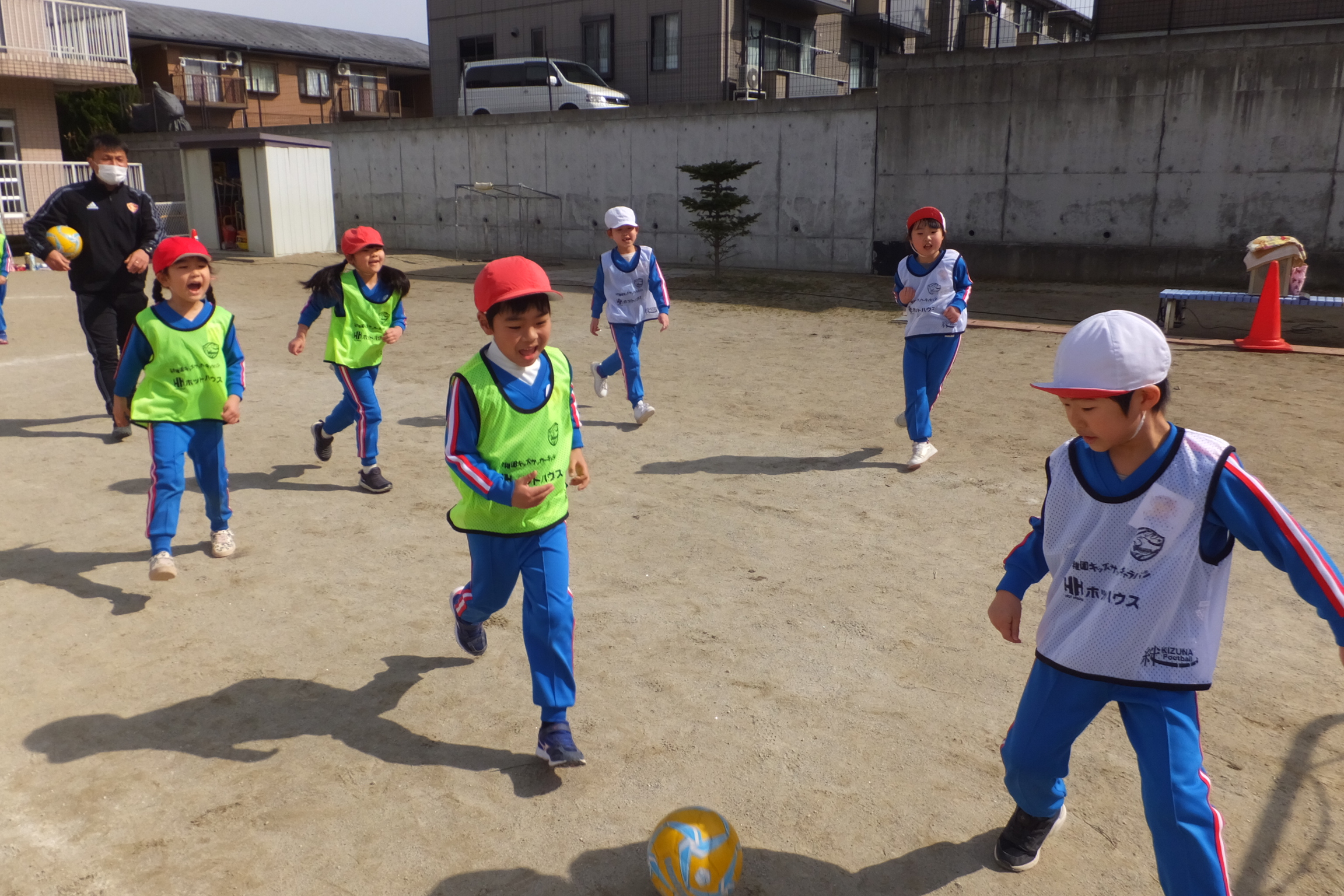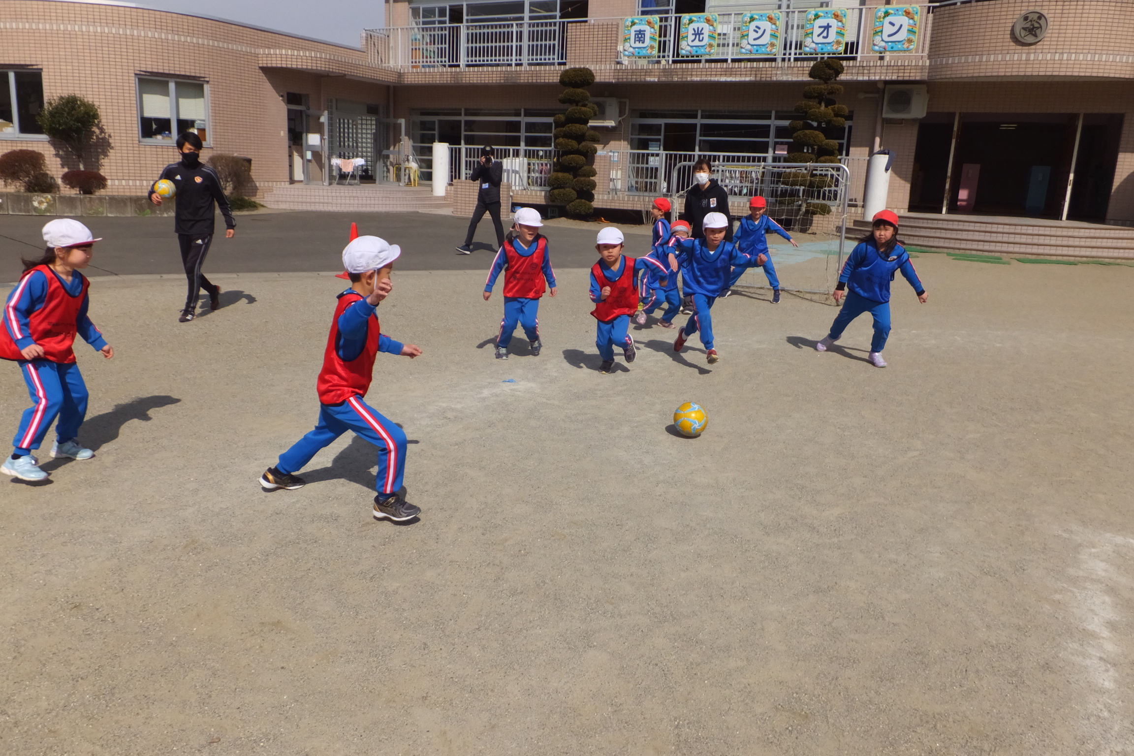 コーチも中に入ったり、次々とボールを出してくれ、子どもたちはいきいきとボールを蹴ったり、友だちと競ったり…と、額に汗をかきながら、サッカーを楽しみました!!